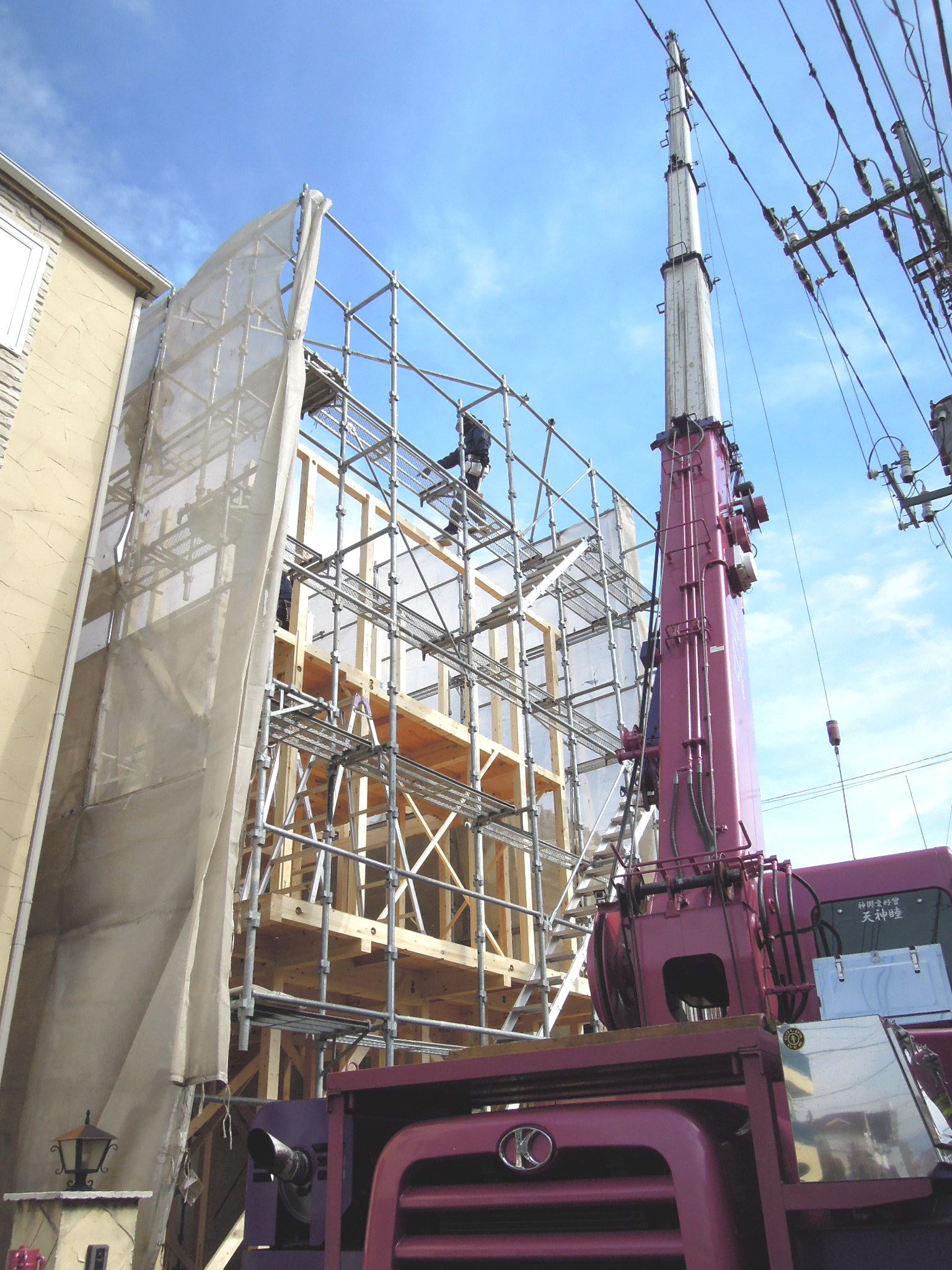 東京都 昭島市 で、木造3階建て 2世帯住宅の 建て方工事です。