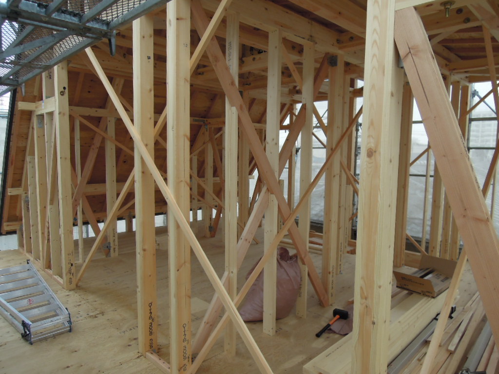 屋根工事も完了。 木工事も順調です。