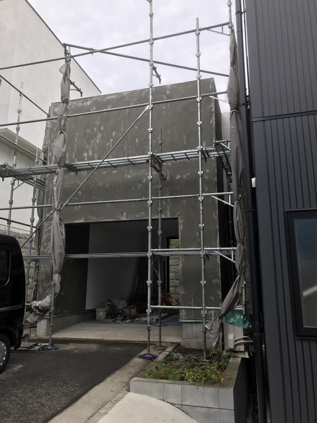 ガレージの増築工事 左官下地塗り、完了です。