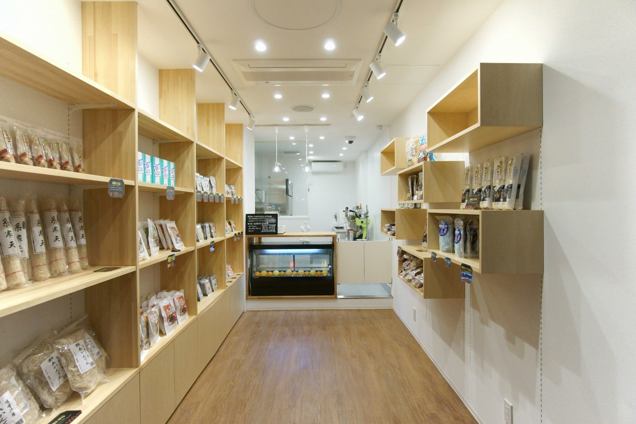 渋谷区で工事中の店舗内装工事。 無事完成しました。 手前側は物販スペース。 左右の棚は可動棚で高さを自由に変えることが出来ます。
