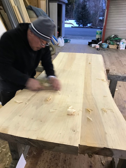 ダイニングテーブルの製作。 2枚の板を金具と接着剤を使用し1枚板に。 1枚になった板の反りを、工具を使って削る作業です。 完成が楽しみです。