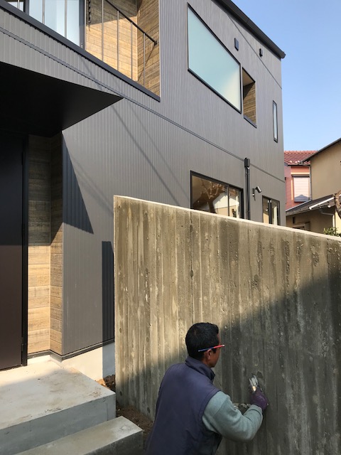 東村山 新築工事。 工事も竣工が見えてきました。 杉板の型枠を使ったコンクリートの塀。 雰囲気のある塀に仕上がりました。
