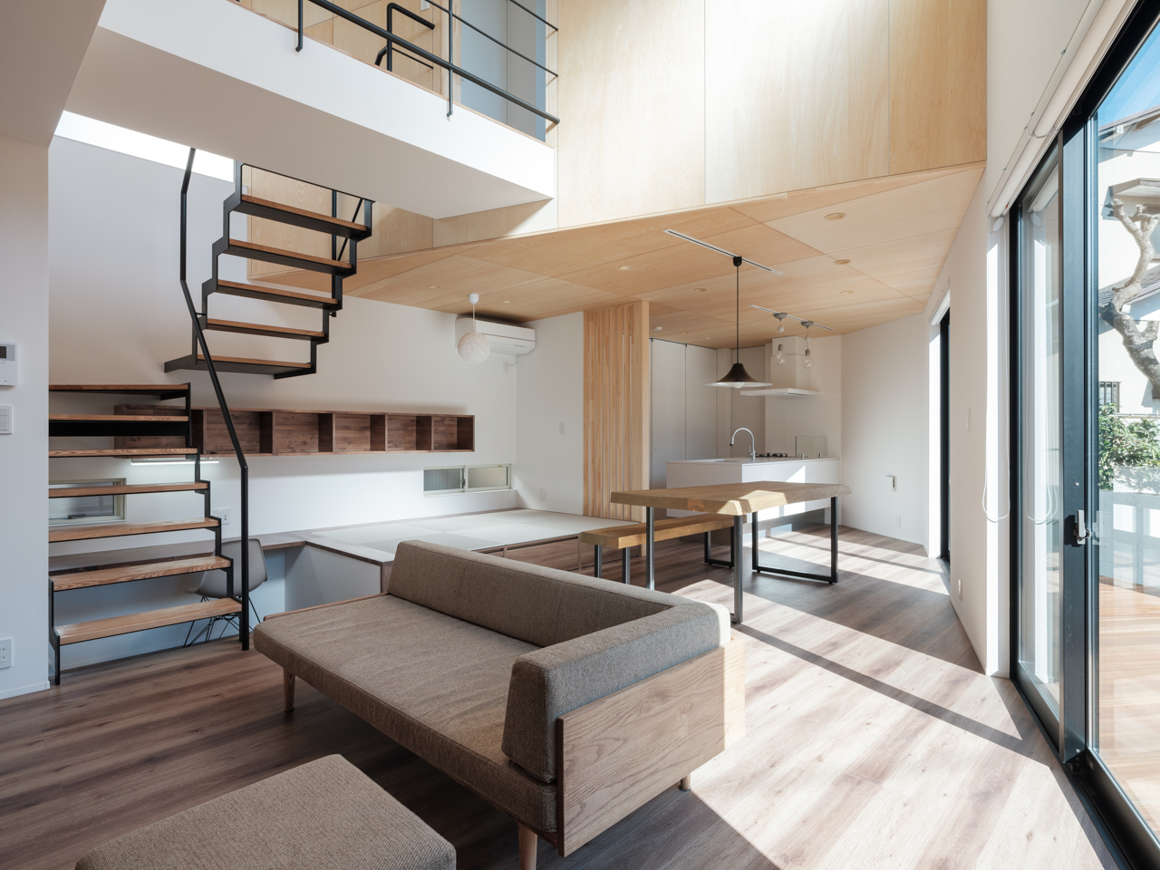リビングの大きな吹抜。 鉄骨階段。 開放感のある住宅が完成しました。