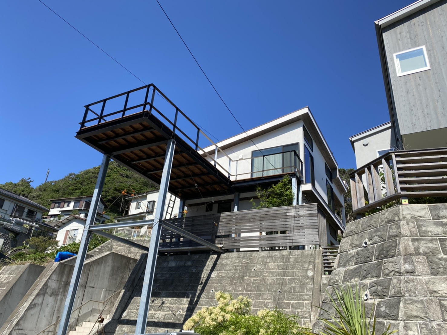 神奈川県鎌倉市 ウッドデッキの工事。 鉄骨で組んだウッドデッキからは、海が一望できます。
